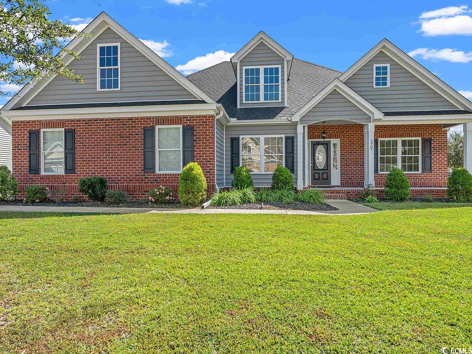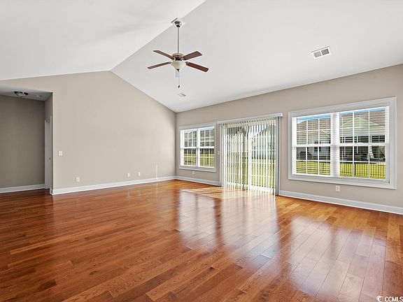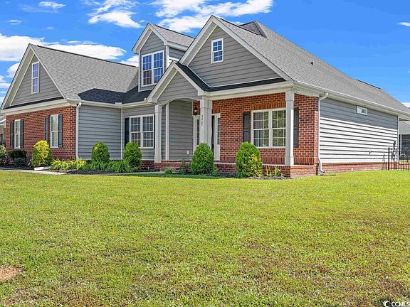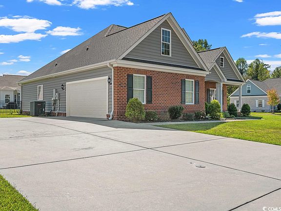 Discover the charm of this former model nestled within the desirable community of Ridgewood West. This thoughtfully designed home boasts a split bedroom plan perfectly positioned for maximum privacy. Upon arrival, you'll be greeted by a welcoming 20-foot front porch, perfect for savoring your morning coffee. At night the home is illuminated beautifully with amazing landscape lighting.  Step through the front door to find a spacious formal entry foyer that seamlessly leads to a well-lit living room featuring an impressive high vaulted ceiling. The room is bathed in natural light through numerous windows and a sliding glass door that opens onto a 23'x10' patio. Adjacent to the living area, a charming door grants access to an 11'x14' covered porch, as part of a spacious, fenced in yard, perfect for outdoor relaxation and entertaining. Beautifully appointed manufactured wood flooring graces the foyer, dining room, kitchen, living room, and hallways, while ceramic tile flooring adorns both bathrooms and the laundry room. Plush carpeting adds comfort to all three bedrooms. The kitchen is a chef's delight, boasting custom dark walnut wood cabinets,  stainless steel appliances, and granite countertops. The private owner's suite exudes luxury with its tray ceiling and a spacious 14'x6' walk-in closet. The en-suite bathroom offers a double vanity, a relaxing garden tub, and a separate walk-in shower.  The guest bedrooms offer ample space for family or visitors. Additional features include a side-entry, 22'x22' 2-car garage, finished and painted, complete with an automatic door opener and pull-down stairs providing access to attic storage. The home also boasts gutters, a raised slab foundation, smooth ceilings, RB3 window and door casings, 5 1/4-inch baseboards, and recessed lighting. Outside, the front yard showcases attractive curb appeal with a landscaped yard featuring an irrigation system and beautifully manicured flower beds. Conveniently located near downtown Conway, Riverwalk Park, excellent dining, shopping, and just a short 25-minute drive from the beaches and entertainment of Myrtle Beach.