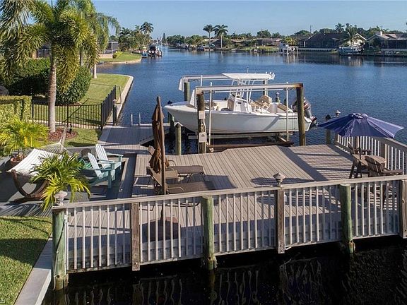 This Gulf access, lake front gem is loaded with upgrades and centrally located for easy access to Veterans or Cape Coral Pkwy via Santa Barbara Blvd. This home has been meticulously done from the lush landscaping and curb appeal to the interior accents including full marble floors with matching marble base boards, custom wooden kitchen with cabinet inserts, Impact windows and sliders throughout, travertine pool deck with salt system and heater. The exterior features are just as nice with a large composite dock with 10K lbs. boat lift and lighting throughout the back yard. This home offers beautiful water views overlooking the lake access that will take you straight down to the Southern tip of Cape Coral in less than 20 mins. and then out to the Gulf. Not only do the upgrade adorn the property but this home has been exceptionally maintained with new outside paint, soffit, and fascia and all duct work and AC over the last 2 years.
