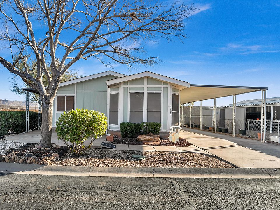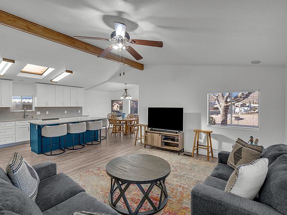 Discover this remodeled 3-bedroom, 2-bath home in the 55+ Lava Bluff community, blending modern updates with functional living. The kitchen features white cabinets, a large island, quartz countertops, stainless steel appliances, and new flooring. The open floor plan with vaulted ceilings feels bright and inviting. The primary bathroom includes a tile shower and freestanding tub. Updates include new plumbing, a newer furnace, central air, updated paint, window coverings, extra-deep covered parking, a storage shed, and a spacious backyard! Right out your front door step enjoy stunning views of Piney Valley!