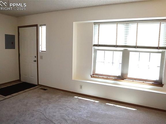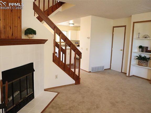 A spacious four bedroom, three bath townhouse with a brand-new roof, gutters, fresh paint, brand new carpet throughout and much more…truly maintenance free in great District 20 Schools. Main level features a spacious living room with new carpet, cozy wood-burning fireplace, built-in bookcase and large window with a nice plant shelf. The open kitchen has an oversized pantry, extensive cabinets, counter space and large breakfast bar. A separate dining area with sliding glass doors walks out to the newly landscaped backyard. A large winding center staircase leads you up and downstairs. Upstairs you’ll find vaulted ceilings and plant shelves in all three bedrooms. The large master bedroom has a nice walk in closet and adjoining full bath. Full bath has a double sink vanity, skylights and built-in linen closet. The finished basement features a spacious family room, under the stairs is extra storage space, remodeled full bath, laundry room with new washer and dryer. The large fourth bedroom has a large walk in closet. The privately fenced, enclose patio is perfect for grilling and entertaining guests. Two assigned parking spaces out front and ample guest parking. The community features green space, a pet walking area, and direct access to the Woodmen Hiking Trail. You are just 8 minutes to Common Spirit St. Francis Hospital for work, close to UCCS, the Air Force Academy and minutes away from I 25. You're just a short walk to grocery stores, restaurants, shops and more!