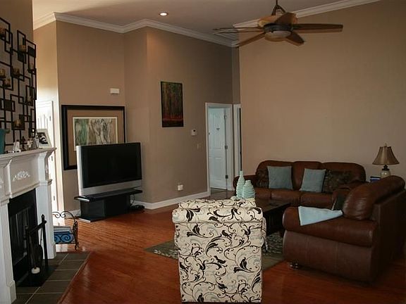 Beautiful European-Chateauesque style home with mature landscaping. From the entryway, a formal dining room is open to the family room. Tall ceilings, gorgeous fixtures, hardwood floors, fireplace and crown molding add designer touches. The family room is also open to the kitchen, with pendant lighting, stainless appliances, custom cabinetry, and solid surface counter tops. The master suite features dual vanities and a jetted tub. Additional living space is provided in the sitting room. Interior colors have been newly freshened and may be different from photos.