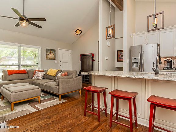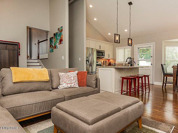 Totally updated & remodeled home for you to enjoy! Not your usual tri-level layout! Open concept. Beautiful vaulted ceiling. Huge kitchen island - offers seating for three and houses large upgraded single-bowl resin sink and stainless steel dishwasher. Custom-built: (tall) kitchen cabinets, island countertops, bay window, real wood flooring and exposed beam. All new recessed lighting in kitchen and new light fixures throughout the main areas of the 1st and 2nd floors. Upgraded ceiling fan on first floor; enjoy ceiling fans in every bedroom. New roof, water heater, fresh coat of paint on the exterior brick. 3 bedrooms and full bath are located on the 2nd floor. Family room, full bath and laundry room with attched storage shelves located in basement. Shed outside for additional storage. The bathroom has built in shelving, tiled floor and shower walls. Master bedroom has custom shelving built into the closets. Floors on 2nd floor have been stained and refinished. Beveled glass tile backsplash and under-cabinet lighting in kitchen. Extra plush new pad and carpeting in basement. Lots of almost full-sized windows in basement lets in lots of natural light. Convenient concrete patio out back.
