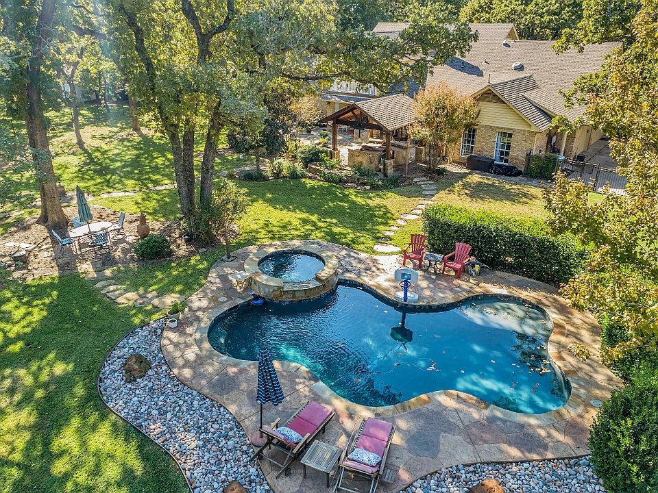 Experience peace & serenity in this gorgeous, one-of-a-kind custom home in Hidden Valley Country Estates. Nestled on nearly 1 acre & surrounded by nature & towering oak trees, this traditional beauty offers 6 bdrms, 4.5 baths, & exceptional living space. With 3 bdrms up & 3 down, it's ideal for multi-gen living. The heart-of-the-home kitchen has SS dbl ovens, pantry, granite CTs & butcher block island. Formal dining in the front & a cozy breakfast nook off the kitchen. Main living area with fireplace & a beautiful view of the back yard. Large den on main level makes a great playroom or office. Upstairs offers a living area + 3 over-sized bdrms with charming nooks, window seats & a balcony. Relax on the front porch or retreat to the private back yard with heated saltwater pool & spa, covered grilling station, wood-burning fireplace & playscapes for the kids. A rare find where nature abounds! Tons of storage & 3-car garage. Excellent Flower Mound location! NEW ROOF & CARPET!