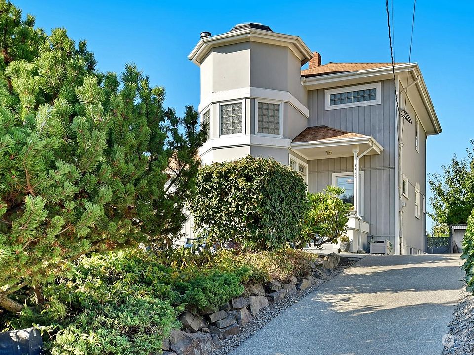 Updated Price! Beautifully sited, high off the street, this unique home offers a rare degree of privacy, with territorial and peek Sound views. Enter to a formal stairway winding up to the very generous primary bedroom with space for study or sitting room, big dedicated bath & adjacent deck. The entry level includes formal living room with oak floors, coved ceilings, wood burning stove & pleasant water views. Well appointed kitchen with ample cabinetry, counter space & an amazing pantry! Formal dining room, 3/4 bath, a second bedroom (currently staged as a den) complete this level. Spacious basement with high ceilings accessible from outside--a perfect work/storage space. Large 9,120 sq ft lot, many updates, excellent neighborhood!