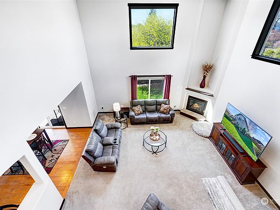 Stunning home on quiet cul-de-sac in charming Anacortes. Soaring 2 story ceiling & cozy corner fireplace in living room. Dining room enjoys decorative columns, tray ceiling & built in shelving. Spacious kitchen with maple cabinets, granite countertops & stainless-steel appliances. Bedroom/office/den on main floor, loft overlooking living room plus 4 bedrooms & two baths upstairs. Primary bedroom with large walk-in closet & ensuite bath with double sink vanity, walk in shower & deep soaking tub. Fully fenced backyard has both covered an uncovered patio, hot tub & shed for extra storage. Bonus feature 3 car tandem garage, 3rd bay being used as a workout room but easily converted back to store a boat or car. This amazing home won't last long!!