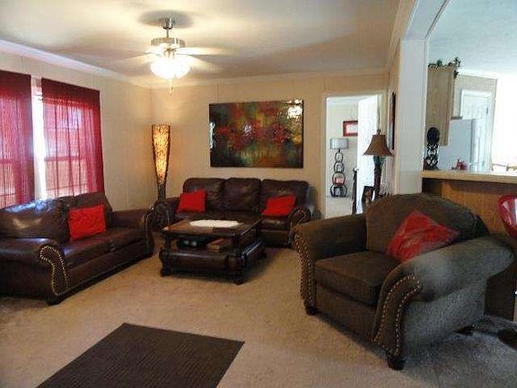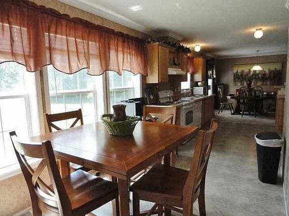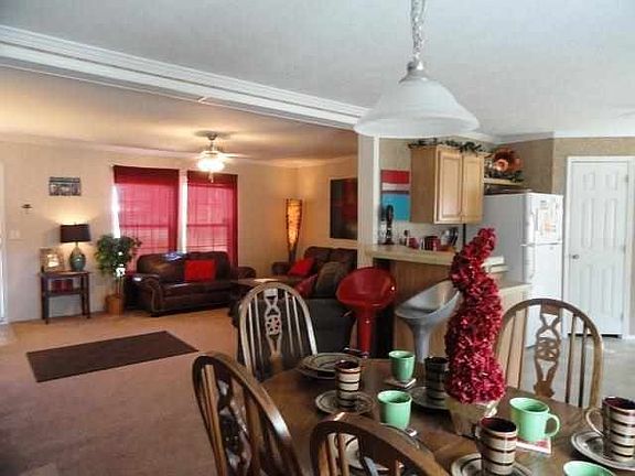 Almost an acre of land and a small workshop comes with this 2008 double wide manufactured home. It has 1680 sq ft, 3 bedrooms, 2 baths, big eat-in kitchen with lots of cabinets, breakfast bar, formal dining room, open floor plan living area. Master has sunken tub, separate shower, walk-in closet. Huge laundry room. deck off the front porch. $500 carpet allowance with acceptable offer. Concrete foundation.