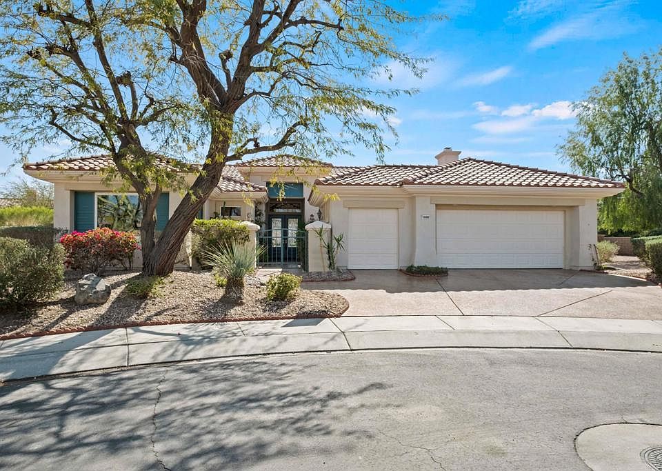 As you walk into the gated front entrance with mature landscaping, you enter a 2,359 square foot MONACO home situated on a TRIPLE lot on a quiet cul-de-sac. Beautiful stone tiles grace the entire home. The kitchen and bathrooms have been upgraded and remodeled with granite counters. The kitchen has brand new appliances. The windowed laundry room (with sink) has a brand new washer and dryer. This home includes 3 bedrooms and 2.5 baths. The primary bedroom has French doors leading to a romantic patio. The third bedroom is very large with French doors leading to a front courtyard. The inviting family room has a gas fireplace.. This entire home as a ''clean air'' system, as the two A/C units have been upgraded with electrostatic filters and air scrubbers. Double car garage + golf cart garage. Finally, as you look out onto the fabulous huge pebble tech salt water pool and jacuzzi, you will notice your own expansive park-like setting to the left and to the right, which could easily fit 2 casitas with HOA permission. The backyard also includes an oversized Viking built in stainless steel grill with a new refrigerator. A gentle serenity path with meditation bench completes the picture!