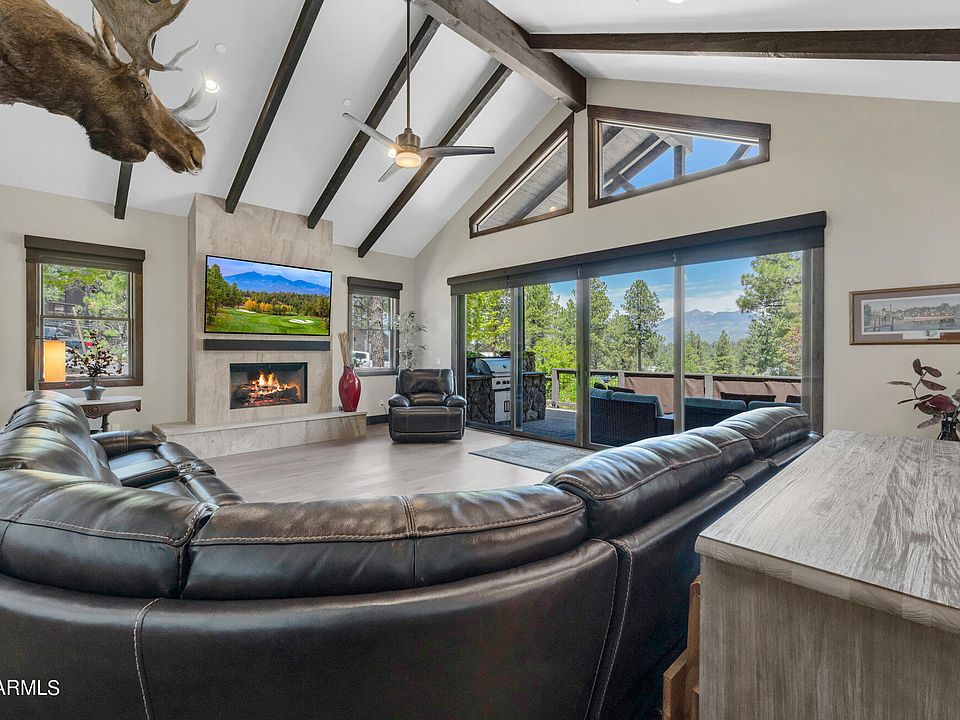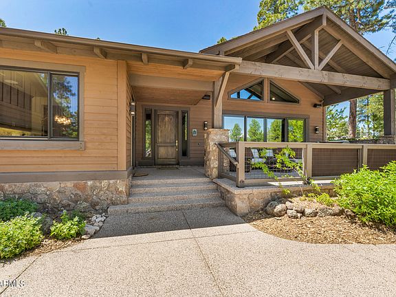 This highly desirable turnkey single level custom home is perfect for entertaining as the kitchen, dining room and living room flow seamlessly together. This one-of-a-kind home features many upgrades including Lutron lighting and intelligent blackout shades system throughout the house. Enjoy the breathtaking views of the San Francisco Peaks from the covered front patio with built-in BBQ. Upon entering the home, you are greeted by a grand floor to ceiling marble gas fireplace, vaulted ceilings with exposed wood beams, and wood flooring throughout. The kitchen is a chef's dream featuring an expansive island with additional bar seating, 5 burner cooktop, built-in microwave, separate wall oven, and a walk-in pantry. Adjacent to the kitchen is a dining area accented with built in bar with wine storage.