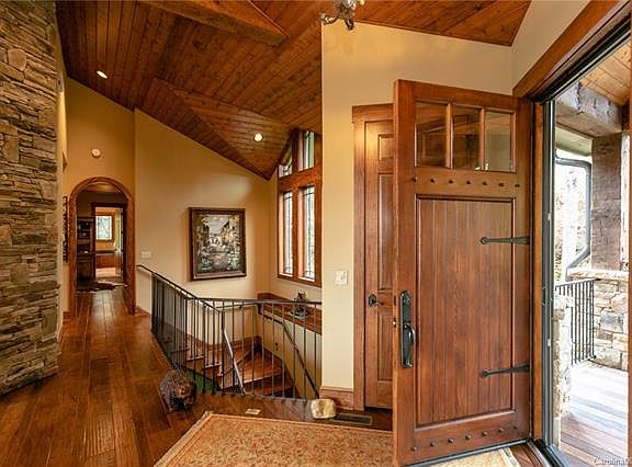 Stunning mountain home featuring custom stone & wood, inside & out, makes a lasting impression from the start. Open floor plan with soaring wood ceilings & beautiful hardwood floors throughout features stone masonry & custom woodwork in the great room, fireplace, & built-ins, as well as the amazing Chef's kitchen. Great room offers large windows for fabulous long-range views from every vantage point, especially from the dining & living area, & gives access to an impressive, covered deck with pine ceilings & stone fireplace for great outdoor entertaining. A main floor powder room can be accessed from the covered deck. Porches surround the home on each floor to take advantage of the amazing mountain views. Walk-in pantry. Main floor master with views from the deck, stone FP, luxury ensuite bath. Downstairs family room, stone FP, built-in entertainment center, dining area, 3 BR, 3BA. Spiral staircase outside linking the decks. Screened porch features suspended swing bed. Furnished