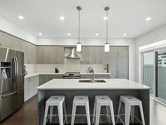 This spectacular end-unit Richcraft townhouse captivates you w/ beautiful curb appeal from the moment you arrive & beckons you to explore further inside. As you enter, you're welcomed by a spacious foyer featuring an oversized front closet, an elegant powder room, & convenient inside access to the garage. The main floor unfolds into a bright, open-concept living & dining area; perfect for both everyday living & entertaining guests. The living room is a true showstopper, w/ soaring two-storey windows, dramatic ceiling height, & a cozy gas fireplace w/ a custom stone surround. The adjoining designer kitchen looks straight out of a magazine, complete w/ custom cabinetry & extended pantry cupboards, crisp white quartz countertops, a sleek tile backsplash, gleaming stainless steel appliances, & an oversized island that comfortably seats four at the breakfast bar. Upstairs, the primary suite is a true retreat & generously sized to accommodate a full bedroom set. It feats a large walk-in closet along w/ a luxurious four-piece ensuite. This spa-like bathroom includes a glass shower, a separate soaker tub, & a modern vanity topped w/ quartz countertops. Two additional bedrooms provide fantastic space & storage, while the main bathroom continues the theme of timeless elegance w/ a tiled tub/shower & a quartz vanity. For added convenience, the laundry is located on the second floor, making chores that much easier. The fully finished lower level offers exceptional versatility, large enough to serve as both a rec room & a home gym or playroom. Step out of the patio door and into the fully fenced, West-facing backyard w/ a large stone patio that allows for enough space for outdoor dining or lounging. With the bonus space this backyard offers, there is also an additional grassy area perfect for kids, pets, or simply relaxing under the sun.This home has been thoughtfully updated throughout with designer finishes & custom window coverings.