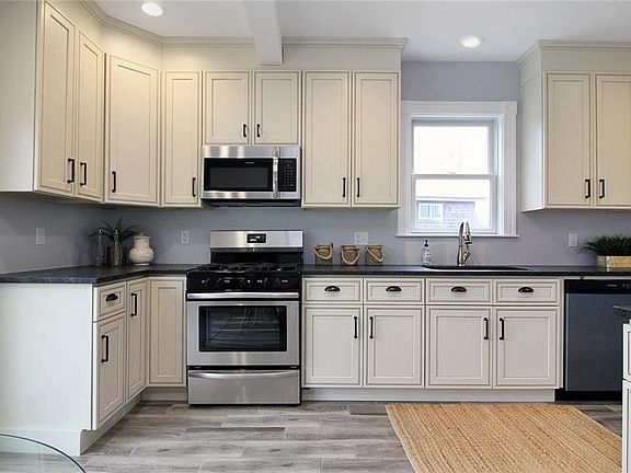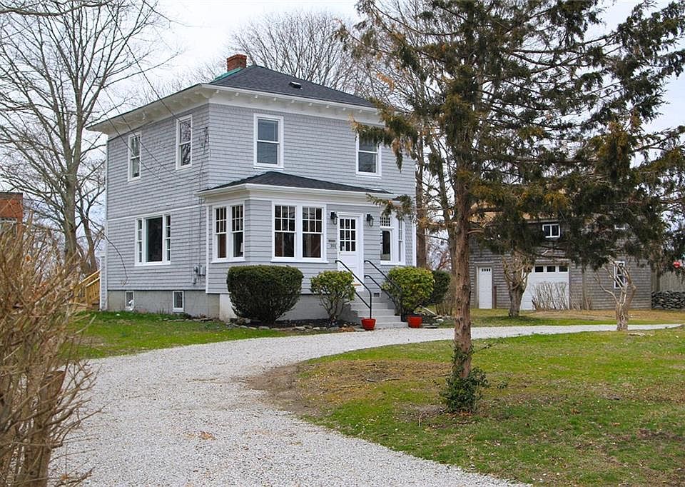 Charming 1900's Colonial Farmhouse completely restored while maintaining many original architectural details! Beautiful hardwood floors, elegant crown molding, pocket doors, wood burning brick fireplace, and all-season front sun room with cozy Knotty Pine panels. Let the sunshine in! Efficient designed kitchen with wall to wall shaker style cabinets, stainless steel appliances, granite counter tops, and convenient eat-in-kitchen for those busy mornings or casual dinners. Additional pantry storage and/or mud room complete the layout. User-friendly French doors lead to a large deck and sprawling yard. This spacious home is advantageous for family gatherings & entertaining with a proper first floor powder room. Leading to the second floor is an exquisite stained glass window on the staircase, three bedrooms, linen closet, and a large full bathroom. The laundry is located in the basement where there is plenty of room for seasonal decoration storage or a playroom. The newer gas heating system accentuates the decorative cast iron radiators. Detached garage (former horse barn with cool remnants like a hitching post & hay stalls) with a loft area has untapped potential as an artist studio or home office. Centrally located on a half acre lot, in a private setting with a splendid driveway, has dramatic curb appeal. Easy access to downtown Newport, Naval Base, shopping centers, beaches, highways, and Frosty Freeze! Perfect for a first time home buyer or a second home retreat!