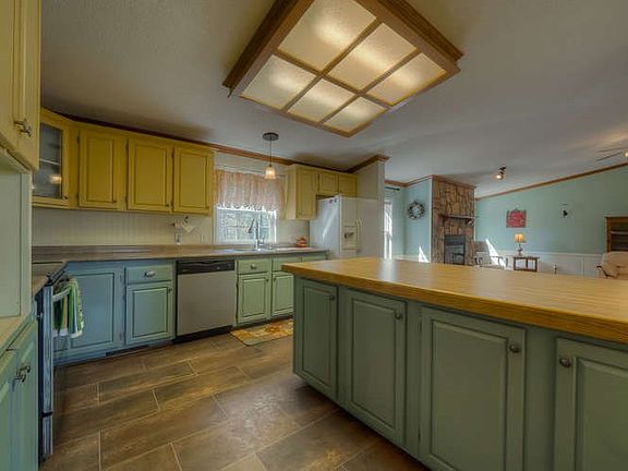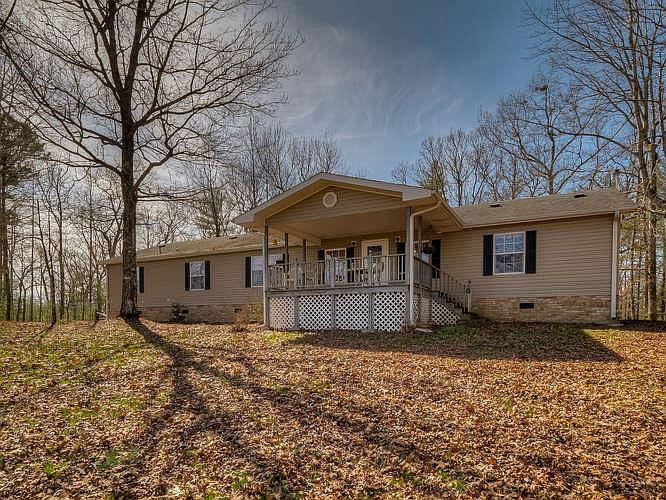 This 4BR/2BA sets on a pretty 1.29 UNRESTRICTED ac w/outstanding pastoral & long range mountain VIEW on a paved road w/easy drive off of a SR. This manufactured home is in excellent condition w/sheetrock walls & pretty brick foundation. Front entrance foyer w/small seating area opens into a lg LR w/gas log FP, connects to good sized DR off of the KIT w/cheery two tone cabinets, beadboard backsplash,butcher bock island w/stools & lg walk in pantry. Back door enters into the laundry w/upper cabinet storage. MSTR has WIC plus dbl vanity in BA. Detached two story two car 'garage' fully insulated but unfinished & currently used as storage but just imagine it finished out as you desire!