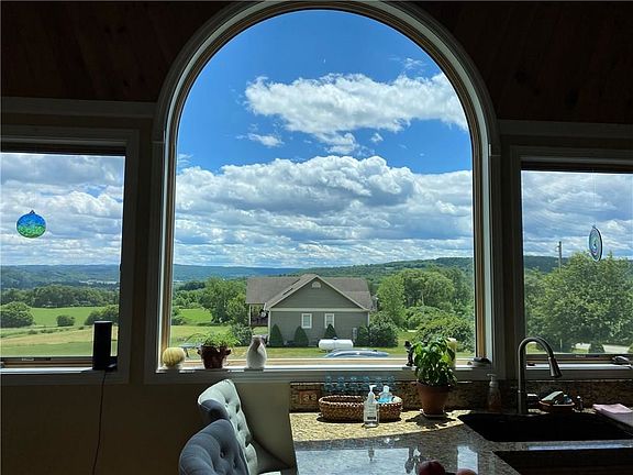 Three bedroom, 2 full bath Contemporary in Arkport School system. Panoramic view from large Anderson windows all around! Reached by open, walk-up stairway, is a 400 +/- sqft bonus room...can be used for office or guest room. Walk-out lower level (400 +/- sqft) is finished and has attached two-car garage. Built with care and quality materials in 2002. Open concept, Kitchen has beautiful cherry cabinetry, granite countertop, breakfast bar, and ceramic floor. Master Suite has spacious closets and an attached large, full bath. Master bath has an exterior door to the tiered back deck! Gorgeous, expansive deck with big above ground pool. Professionally landscaped all around.