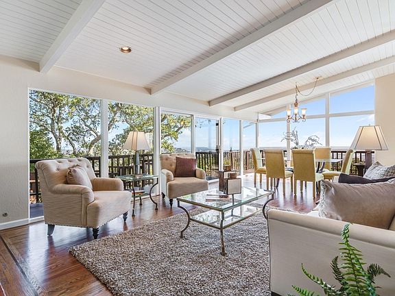Pick the song, On a Clear Day You Can See Forever or I Can See For Miles, the view here is fantastic! San Francisco to the north, the East Bay, Mount Diablo, Moffett Field and beyond in Silicon Valley. This is a true find in the San Carlos Hills. Living, dining, and family room all with a vaulted ceiling and views through walls of glass. Inviting fireplace in living with custom mantle. Formal tiled entry. 3 bedrooms with a very large primary suite with walk-in closet. Galley kitchen features custom cabinets and Sub Zero refrigerator. Family room has delightfully designed built-ins. Private patio perfect for entertaining, wrap around deck, secret garden area below, all enhance this exceptional setting. New paint, interior/exterior. Newly refinished and stained hardwood floors throughout. Easy access to 280, downtown, parks and great San Carlos Schools!