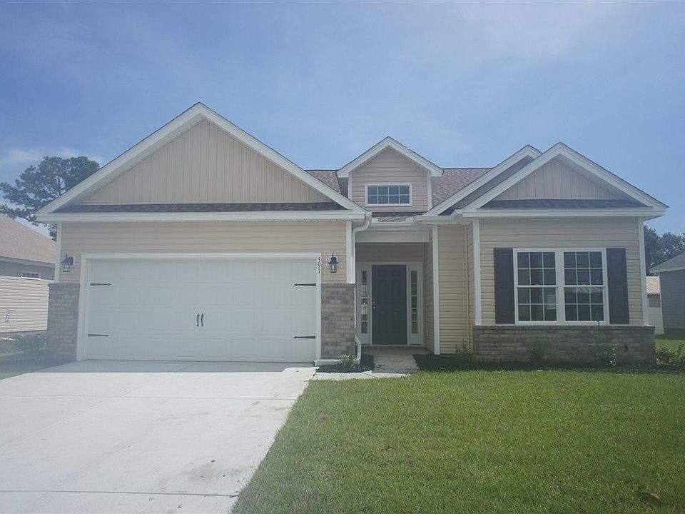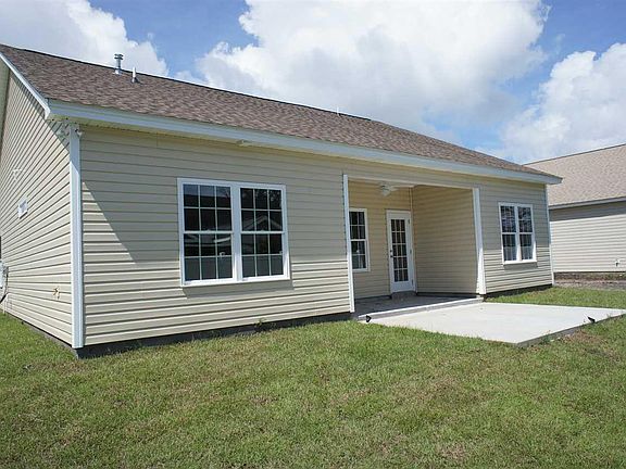 Beautiful Hatteras floor plan in the new Ocean Palms community, currently under construction and scheduled for completion in early October. This terrific open floor plan, 3 bedroom, 2 full bath home has a live dormer with a high ceiling and vault over the great room and wood-look vinyl flooring throughout. Stainless appliances, granite counters, staggered-height white painted Shaker-style cabinetry and a convenient breakfast bar combine to give you the wow factor you're looking for, and abundant recessed lighting plus two large windows in the adjacent dining area flood the room with light. There's even a large walk-in pantry. A French door in the great room leads to the covered rear porch and the large separate patio beyond. The spacious owner's suite features a long vanity, an oversized walk-in shower, plenty of storage in the linen closet and a huge walk-in closet, plus a tray ceiling. Two additional bedrooms and a full bath are tucked off on their own hallway, for privacy. All of the homes in Ocean Palms come standard with the luxury of natural gas (tankless water heater, gas heat, and gas range). The two car garage is completely trimmed and painted, and a floored attic storage space is accessed by drop-down stairs. Ocean Palms is conveniently located near shopping, restaurants, schools and world class medical offices and hospitals, and only a short golf cart ride to Surfside Beach's gorgeous beach and the beautiful Atlantic Ocean. Other floor plans and inventory homes may be available, and CUSTOMIZATION OF FLOOR PLANS IS POSSIBLE!!! Community Pool and Cabana are now open! Photos are of a completed, similar home and may have different features.