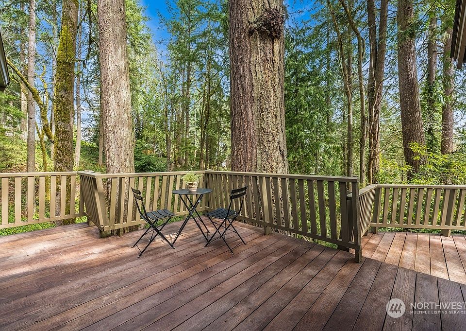 Nestled into the coveted Squak Mountain community, this shy half acre turnkey rambler offers you cozy, quiet living with peek-a-boo views of Tiger Mountain. This immaculately maintained 1770 SF, 3 bedroom/1.75 bath home has an ideal layout with a mid-century modern feel. You will love the soaring wood slat ceilings, hardwood floors, custom cabinetry, brand new roof, wonderful garage shop/workspace, wood burning fireplaces and windows framing picturesque, wooded views out the back of the home. The backyard boasts a large wrap-around deck perfect for entertaining or enjoying your morning coffee. Superb access to hiking trails, desirable ISD schools and all Issaquah has to offer. Welcome home!