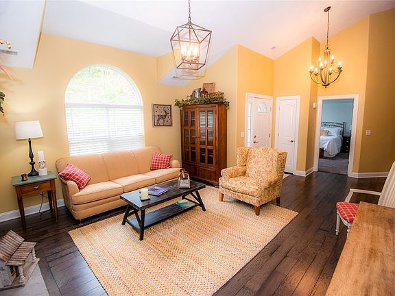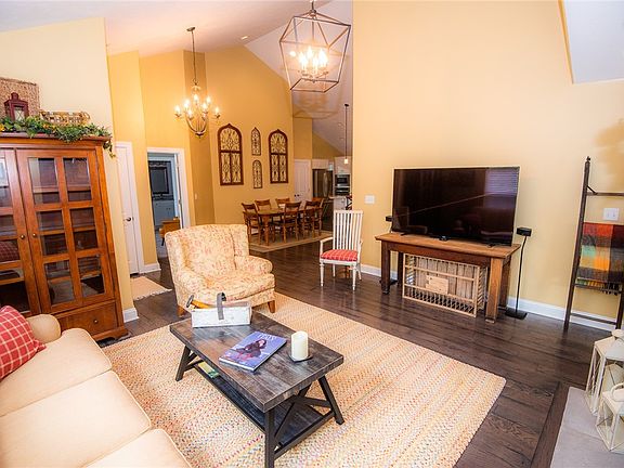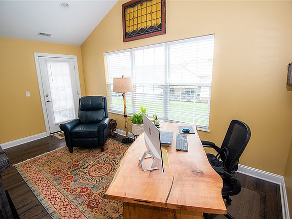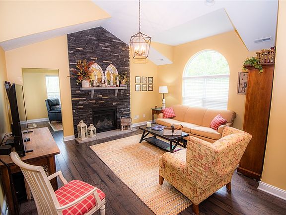 Private rear unit one level living in this maintenance free 3 bed 2 bath patio home in the luxurious Hunt Club community with so many amenities~Enter into the open floor plan with soaring vaulted ceilings and beautiful hickory hardwood flooring in the main living areas~Living room offers a floor to ceiling gas fireplace and lots of natural light flows in~Off the living room is a sunroom with another fireplace and direct access to the covered patio with awning (not currently installed for summer yet)~The large dining room opens to the gourmet kitchen with quartz counters, upgraded SS appliances, and white shaker cabinetry~Just off the kitchen is access to the laundry room with sink and storage~Relax in the master BR with large walk in closet and spa like bath with walk in ceramic shower w/ seat and double sinks~2 additional bedrooms are on the other side of the home to allow guests privacy~Great private outdoor space in this rear unit~Lots of storage everywhere!~Move in and enjoy!