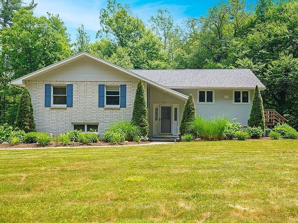 Showings begin at the OPEN HOUSE Saturday 6/23 11-1. WELCOME! This home is located in desirable southern Belchertown with a picturesque country setting yet only minutes to MA Pike. Large, open floor plan in main living area for easy conversation. Updated kitchen with granite countertops, stainless steel appliances, and tons of cabinets! Living Room with cathedral ceiling, a wood burning fireplace, and an oversized slider that leads out to a wraparound deck overlooking your private yard. Dining Room w/extra-large window. Master BR has two large closets upon entering and a ½ bath. There is also an updated full bath w/heated/jetted tub and plenty of cherry cabinets for storage. Lower level has over 600sqft extra living space with a brand new floor installed in family room along with a custom fieldstone fireplace; and ½ bath. Laundry room. Heated/oversized 2 car garage. '14 new roof; '15 Tankless combi heat & continuous hot water boiler. Central AC. Lovely home in great area!