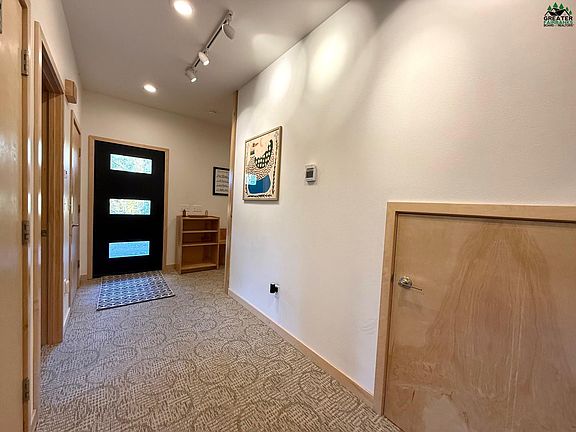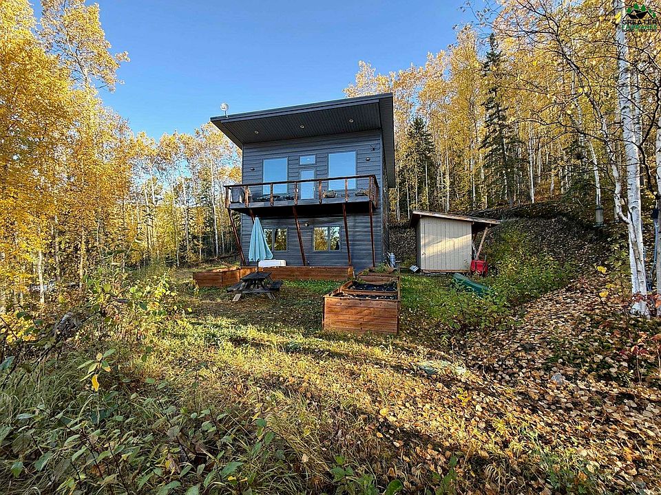 Experience modern Scandinavian-inspired living in this architect-designed, passive solar home, built with a 6+ star energy rating (in 2014) and geothermal radiant floor heating — no fuel bills required. A Blaze King wood stove adds cozy warmth, while thoughtfully designed airflow patterns help keep the home cool in summer. Inside, soaring ceilings, expansive windows, and cork flooring create a warm, light-filled atmosphere and showcase sweeping southwesterly valley views. The chef’s kitchen is the heart of the home, featuring a striking 14-foot poured concrete countertop (recently resurfaced), stainless steel appliances, a pantry, and open-concept flow for entertaining. Upstairs, the large deck is perfect for grilling, dining, and soaking in the sunsets. The lower level offers two spacious bedrooms, a generous bath with oversized tub and poured concrete countertop, plus abundant storage with a coat closet, under-stair space, and a large crawl space. Walls throughout are finished with Farrow & Ball paint for timeless style. Set on 5 private acres, the property includes raised garden beds, a sauna, chicken coop, wood and storage shed, and an additional large out building that could be a storage area, yoga studio, or whatever a buyer desires! Trails begin right outside your door, offering wildlife, northern lights, and peace in every season. A transfer switch with a new generator adds peace of mind. The location is hard to beat — close to UAF, Moose Mountain Ski Hill, and in town amenities, all just a short drive away. This is a rare chance to own a sustainable sanctuary where design, efficiency, and natural beauty come together.
