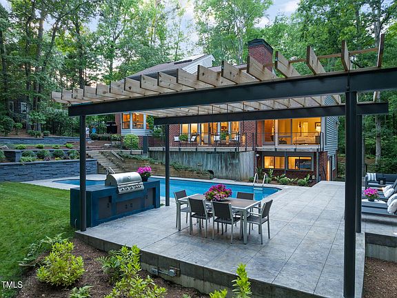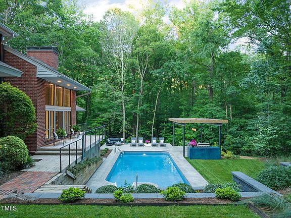 Step into one of Durham's most exceptional homes, where architectural pedigree meets thoughtful modern luxury. Originally designed by renowned modernist architect Jon Condoret, this residence was extensively and artfully renovated over the last five years by acclaimed architect David Arneson to create an extraordinary fusion of timeless design and elevated livability. Situated on a rare double lot in the heart of Hope Valley, this home offers one of the most extraordinary backyard spaces in the neighborhood. The resort-style pool and lush outdoor living areas are an entertainer's dream. A custom pergola, outdoor kitchen, and extensive hardscaping carry the home's architectural language seamlessly into the landscape. Inside, the home features custom handcrafted woodworking by Piedmont Joinery, including a striking sapele hardwood bar with oversized dovetails assembled on-site. A modern lighting plan throughout incorporates custom built-in fixtures and carefully selected designer pendants and chandeliers. The owner's suite is a private retreat, featuring floor-to-ceiling wraparound windows that frame serene views and bathe the room in natural light. The suite includes a private deck overlooking the pool, a boutique walk-in closet, and a custom-built vanity that together add style and function while also continuing the home's commitment to detail and luxury. For movie lovers, the built-in 12-speaker Dolby Atmos movie room delivers a premium home theater experience rarely found in a private residence. The home's passive solar orientation ensures efficient year-round comfort and abundant natural light. With a legacy of architectural distinction and a renovation that honors and enhances its modernist roots, 3910 Somerset Drive is more than a home—it's a one-of-a-kind statement in design, function, and lifestyle. Homes of this caliber and character rarely come to market. Don't miss your chance to own a piece of modernist history in one of Durham's most coveted neighborhoods.
