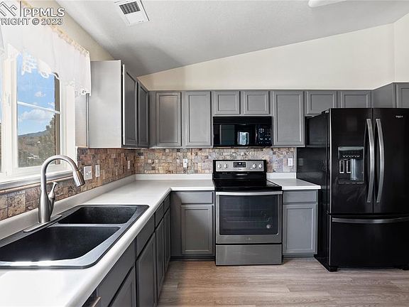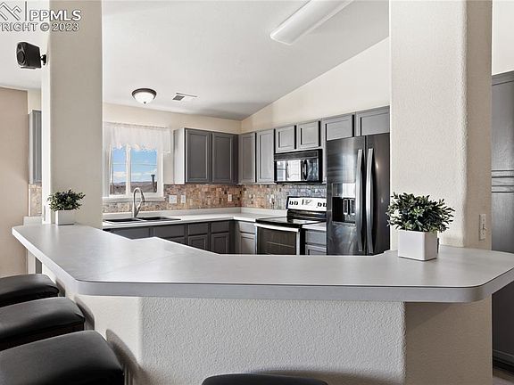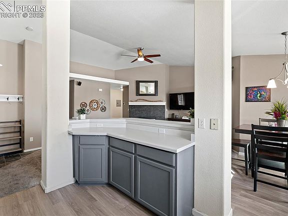Vaulted ceilings with 3 bedrooms make this open floor plan in Strawberry Fields one of the most sought-after properties in the area. A spacious kitchen with wrap around breakfast bar opens up into the living room and dining area which is perfect for entertaining. A sliding glass door with a covered balcony is located off the living room. Gas fireplace perfect for those chilly Colorado evenings. Private bedroom with full bath featuring a double vanity and soaker tub. The primary bedroom also features a private walk-in closet. There are two additional bedrooms with a full secondary bath, as well as a full-size laundry room. One private garage is in addition to a carport. This home has been updated with LVP in the kitchen and bathrooms, newer carpet, and tile. Newer appliances, A/C, and hot water heater are also featured in the home. 1 Garage + 1 Designated Carport included for parking! Gated community with clubhouse, tennis courts, pool, and exercise facility. Close to shopping, dining, Ft Carson, and Cheyenne Mountain Resort.