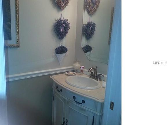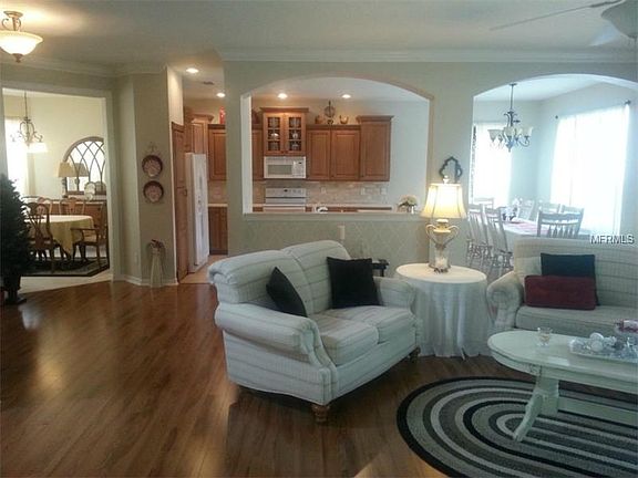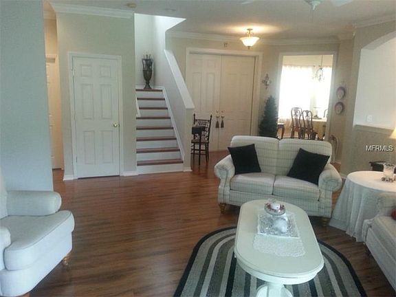 Like new 5 bedroom, 3.5 baths, two story home on a quiet cul-de-sac. Immaculate inside & out. Upgraded kitchen, maple cabinets & solid surface counters. Breakfast area seats 10. Open family room with wood laminate floors, crown moulding & sliders overlooking private nature preserve. Additional flex room can be a den, office or formal dining. Spacious first floor master suite with views to the backyard, crown moulding, large walk-in closet & bathroom with double vanities; separate tub & shower. A stately half bath & laundry on first floor. Additional very large walk-in closet great for a pantry or storage. The second floor includes a spectacular, large family room with a great view; four bedrooms, two full baths & a loft area great for ac computer center. One bedroom holds a king sized bed & has two closets for a second floor master if needed. Charming bay tower on the front gives the flex room & a second floor bedroom four beautiful windows for a sunny look. The two car garage is large & has an oversized attic for storage to keep your garage free for vehicles. House is freshly painted, manicured landscaping & terrific neighborhood with community pool. No CDD fees; low HOA fees.