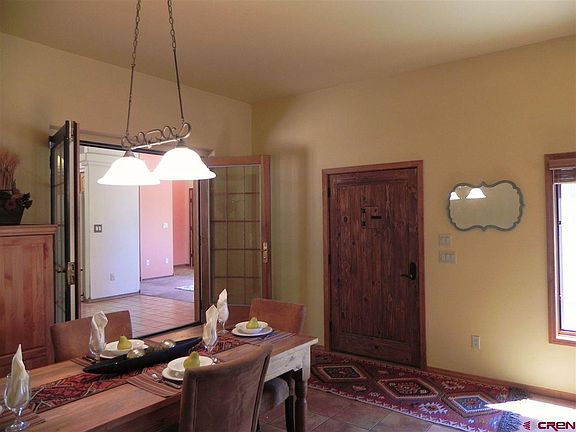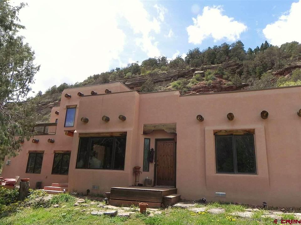 You'll be awed by the views from the front patio and the gorgeous red cliffs from the back patio when you arrive at this spacious southwest style home in the North Animas Valley. The property is a unique, natural setting perched on a gentle hill above the valley floor, near a hiking trail, and is almost 5 irrigated acres with easy access near the waterfall off CR 203. This home is actually two homes combined with a common kitchen in the middle, which can be configured in several ways, depending on your needs, such as a mother-in-law quarters. The original residence features 3 bedrooms and 2 baths on one level, along with an open living, dining and kitchen area. The newer addition to the south includes an open living and dining area, private office, large laundry room and bath on the main level, and upstairs you will find a second master bedroom with access to a private balcony, along with an additional bedroom and full bath. Charming details can be found throughout with many built-ins, exposed log beams, Spanish tiles, corner gas fireplace, covered hot tub, and mature trees and perennial flowers. A single car carport is attached to the home, and there is also a detached artist's studio and storage building. Enjoy the views, privacy and serenity of rural living with the convenience of being only 10 minutes from downtown Durango with no covenants or HOA dues and room to grow! Home has been pre-inspected and includes a one year home warranty for the buyer at closing.