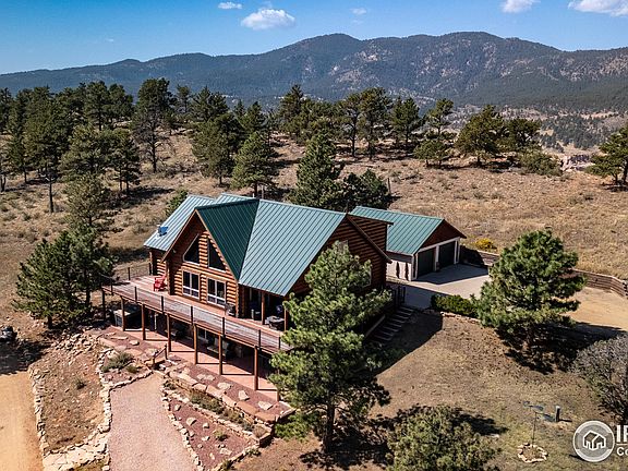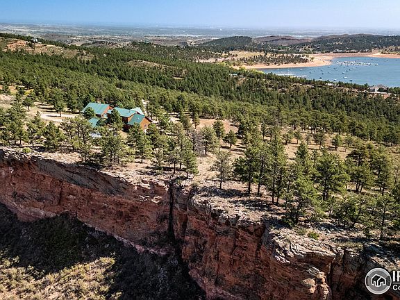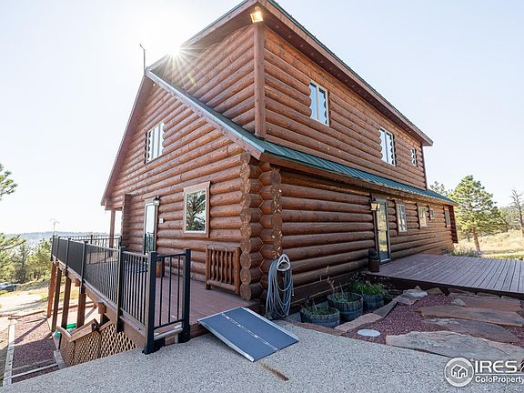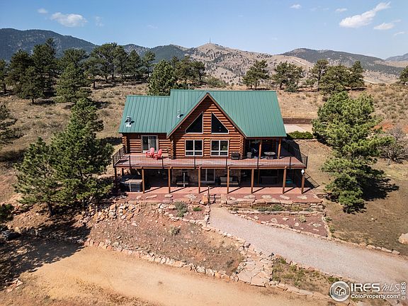Perfectly positioned at the top of the private ridge with gated security access between Carter Lake and the soon to be completed Chimney Hollow Reservoir, sits this beautifully designed and authentic log home. At nearly 4000sqft, there is plenty of room for your large family or guests to spread out and decompress. Incredible views in every direction are accentuated by the huge wrap around main floor deck and large covered lower patio, perfect for wildlife viewing. Main floor extended ceilings with large doors and windows bring the beauty of the outside into this extremely comfortable home. Created as an open concept, the main floor has primary bed/bath/walk-in with deck access, family room with vaulted ceilings, kitchen with hickory cabinets, walk-in pantry, attached dining, laundry, half bath and deck that's accessible thru french doors. Primary bedroom log design furniture included in the sale. The walkout lower level has 2 more large bedrooms (the largest one currently being used as an entertainment area), rec room, full bath, wet bar area with wine fridge, microwave, mini fridge, bar top, large storage room and mechanical room. Included pool table and chairs finish off this room and spill out onto the large covered patio. The upper level houses yet another bed and bath plus a very large open loft area that can be office, study, library or hobby/craft room. The 2 car detached garage is oversized at 25'x25' and sits just off the laundry/mudroom entrance. The other workshop/garage is 35'X45' with 12' covered outside area and 2 enclosed bays each about 16' wide and 34' deep, and one is heated with a pellet stove. With over 20 acres, absolutely plenty of room for your toys and vehicles. At about 6100' the established views down to Carter Lake and the foothills to the east must be seen, they're hard to describe. On the west side of the ridge, beautiful rock outcroppings are your seat to views of Chimney Hollow Reservoir. Check documents for more information.