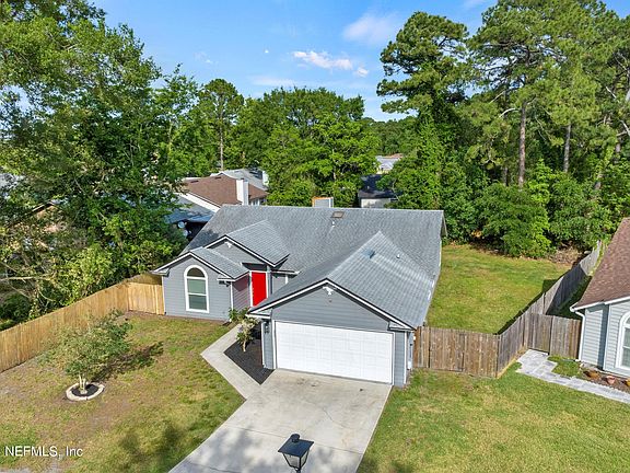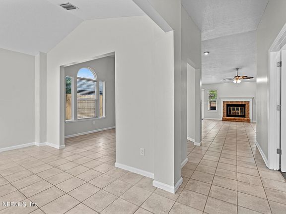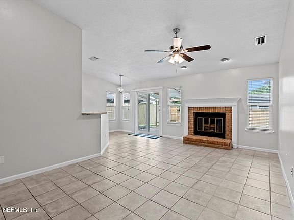 Discover your dream home with this upgraded and affordable property, ideally located less than a mile from St. Johns Town Center with a low HOA of $108 annually. This home boasts 3 bedrooms and 2 bathrooms, plus an additional room complete with a closet area and French doors, perfect for a home office, playroom, or a fourth bedroom. Enjoy tile flooring in the living areas and luxury vinyl plank in the bedrooms and hallways. The residence features two living spaces, a formal dining area, and a kitchen that opens to a cozy breakfast nook. A wood-burning fireplace adds charm to the space. The primary bathroom includes an oversized tub/shower combo, while the second bathroom offers easy access with a large walk-in/roll-in shower. The expansive backyard is an oasis with a paver patio, lanai, hot tub, and ample space for a pool.