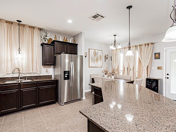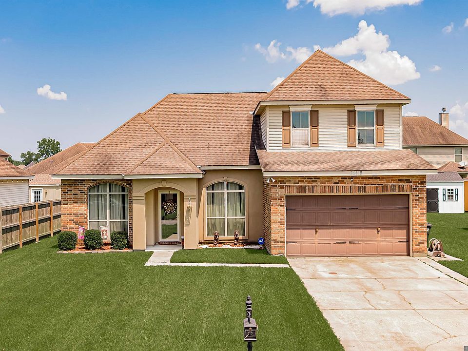 We have opened up the family room to the kitchen, added a huge kitchen island with bar and seating, enlarged the master bath and master closet. This home now includes 9' ceilings and crown moulding throughout the first floor family room, living room, dining room and master bedroom. Custom French doors have even been added to formal living room. This home has everything you are looking for in a home with beautiful French Country style and plenty of brick. 4 Bedroom 2 1/2 bath home with the master bedroom downstairs. The large open kitchen includes more than enough cabinets and counter space. Slab granite countertops are throughout the kitchen and bathrooms. Kitchen appliances are stainless steel. The master suite includes a large walk in closet, whirlpool tub and separate shower. Entertaining is easy with surround sound pre-wire and speaker wiring outside on the covered back porch. No flood insurance is required and this home is built on a top quality post-tension foundation.