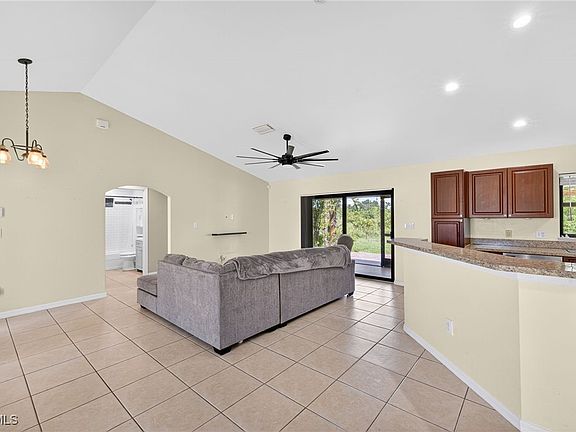 Upon entering you will notice the tall vaulted ceilings, open floor plan design and ceramic title flooring. This home features a large living room, open kitchen with Rich Cherry Cabinetry and breakfast bar and a formal dining room. All Bedrooms have new carpeting, the Primary Bedroom features tray ceilings, walk-out door to the lanai, walk-in closet, and an ensuite with dual sinks, linen closet, custom tiled shower and soaking tub. The spacious guest bedrooms are on the opposite side of the home for privacy when your guest arrive to enjoy the Florida Lifestyle. This home also features an indoor laundry room with washer and dryer, a 2-car garage with pull-down stairs to the attic and an automatic garage door opener. Enjoy your cup of coffee or nightly book on the huge lanai, featuring an overhead pergola and portable hot tub. The home is made of Concrete/Block Construction and has a large back yard, located near restaurants, shopping, hospital, 2 baseball spring training facilities, and a short drive to Fort Myers and Sanibel Beaches.
