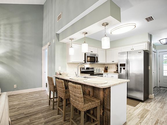 Owner has spared no expense on this completely renovated 2bd/2ba beach home perfect for a retired couple or an investor looking for a prime rental property. Just a short walk or golf cart ride to the beach. This home offers vaulted ceilings in the living area, large spacious bedrooms, Driftwood tile throughout and a wood burning fireplace with Pecky Cypress mantle. Kitchen upgrades include stainless steel appliances, tiled backsplash, Carrara countertops and a large pantry. Each bedroom comes complete with a modern tile bath and private patio. A Large screened porch and patio helps create an oasis in your private back yard. Beautifully landscaped lawn complete with zoysia grass. This home is on CITY SEWER and includes tankless hot-water heater and new standing seam metal roof 2019.