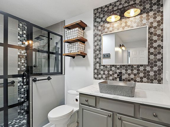 You won't find a home with more updates and improvements than this amazing townhome! Step inside to an open 2-story great room with hickory floors and the perfect gas fireplace. This space is open to the kitchen/living room where you'll find quartz counters, frosted glass-front painted cabinets, under cab lighting and stainless appliances. The dining area leads outside to your own private retreat. A fenced yard with stamped concrete patio plus a separate paver patio, water feature and attractive landscaping combine for the perfect place to relax. The first floor includes a large bedroom with walk-in closet and fully renovated bath including glass door shower, vanity, flooring and toilet. Upstairs you'll find 2 additional bedrooms connected by a jack-n-jill bathroom. The basement was recently finished with a large rec room, bar and fireplace plus a flex room that could double as a 4th bedroom. Ask your agent for a full list of the updates and upgrades. There are too many to list here!