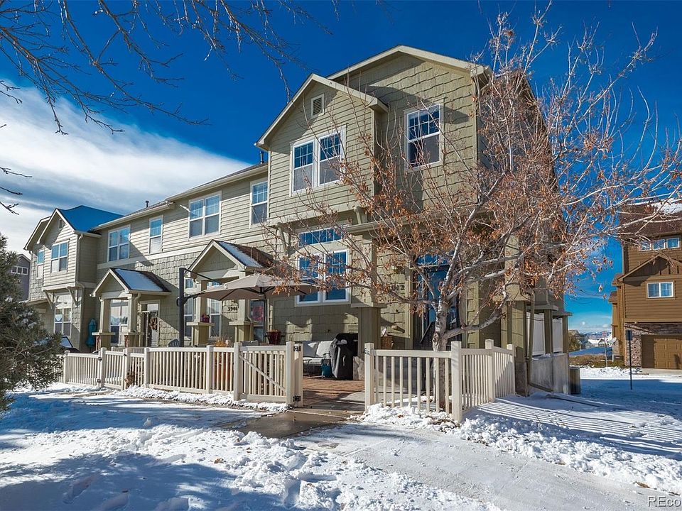 Rare Larger End Unit Townhome on Prime Pocket Park Lot. Great lay-out with open renovated kitchen with counter seating, separate dining space that is open to large living room. Large laundry room with storage. Spacious ensuite primary bedroom above with two additional bedrooms and another full bath on upper level. Mountain Views from Primary Bedroom. Tons of updates throughout. Freshly redone kitchen with polished Quartz countertops. Newer wood floors and carpet. New AC, 50 gallon H2O heater, and 75% of windows replaced with double-hung, triple pane windows. Newly added whole house humidifier, water softener, and water recirculating system. Enjoy the new stamped concrete patio on the west facing patio for sun and park access. 2 Car attached garage with new epoxy floor and built in storage. More storage in crawl space. This unit lives large! Enjoy two pools nearby at The Grange and The Taft House, and direct access to miles of paved and unpaved walking trails. Central Castle Rock location near shopping, schools, parks, and easy access to I-25.