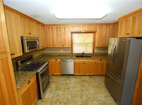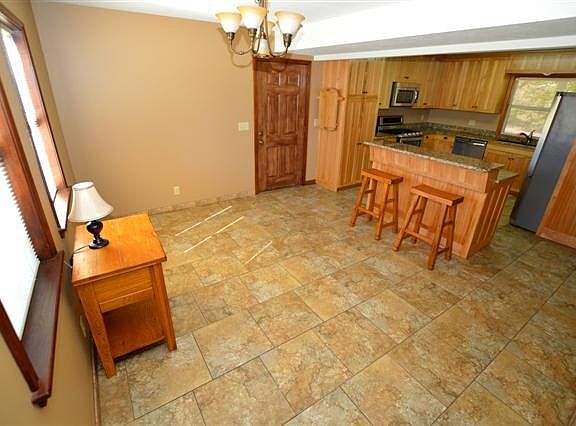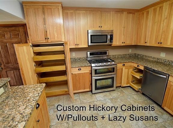 WOW! Gorgeous custom Hickory cabinets, granite counters, warm Oak flooring thru out, tiled walk-in shower, his/her walk-in closets, big country porch with swing + 30x65 insulated pole barn w/electric, cement floor & wood stove.