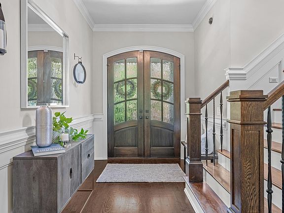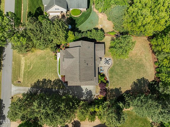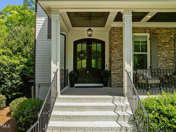 Custom-built home in a cul-de-sac of the Villages of Wynchester with open-concept living, coffered ceilings, and hardwood floors. The gourmet kitchen boasts granite countertops, Bosch induction cooktop, GE refrigerator, floor-to-ceiling cabinets, and a walk-in pantry with a modern glass door. Main-floor guest suite with full bath. Upstairs, the primary suite offers two walk-in closets, a spa-like bath with soaking tub, separate tiled shower, warm wood cabinetry, and a private water closet. Additional bedrooms, bonus room, office nook, and a spacious laundry room with utility sink and built-in ironing board. Unfinished third-floor attic with plumbing rough-in offers expansion potential. Enjoy a screened porch, large patio, and a treehouse-style front porch overlooking wooded views. Extra-large 3-car garage. Community pool access and low taxes. Convenient to I-540, Jordan Lake, RTP, Cary, and Raleigh.