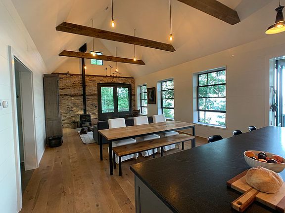 A unique opportunity to relax and live in a new home on the shore of the St Lawrence. A professionally designed riverfront home just outside the village of Clayton. Unforgettable sunsets with expansive channel views from a quiet private road. 135 feet of waterfront bordering TILT's Zenda farm preserve, within a 5 minute golf cart ride to the Clayton Yacht Club. 2995 sf, custom built, solid concrete ICF constructed home with three bedrooms and three full bathrooms. A downstairs den could be converted to a fourth bedroom if needed. The floor plan, professional kitchen, large deck doors and vaulted ceilings give this home an open inviting feeling. Amenities and finishes include : Master steam shower, tile, wood and polished concrete floors all with radiant heat, developed landscaping, custom stone and concrete work, a separate two stall garage with attic storage, oversized Marvin windows, reclaimed wood (beams, counter tops and walls) cabinet grade white painted t+g walls, natural stone tile and reclaimed brick. Brokers Welcome. Buyers agents percentage protected. Pre-approved offers appreciated.
