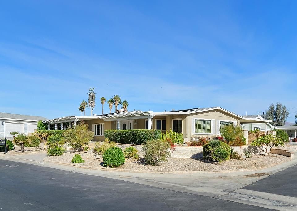Experience the ideal combination of comfort and convenience in this beautifully designed 2-bedroom, 2-bath, 1,936 sq. ft. home. The home's incredible curb appeal is evident from the moment you arrive, with low-maintenance landscaping and stone accents setting the tone. Step through the leaded glass front door to an open floorplan, ideal for entertaining. The kitchen features stainless steel appliances and ample storage and connects to the formal dining area, formal living room, and a spacious family room with a wet bar. The primary suite offers a serene retreat with a walk-in closet and a bathroom featuring a soaking tub, a tile shower, and dual vanities. Additional highlights include double-pane windows with plantation shutters and tile flooring in the kitchen, family room & bathrooms. Step outside to enjoy the spacious covered patio, where stunning west-facing mountain views create the ideal setting for relaxation or socializing. A large storage shed and covered carport parking add practicality, while 30 leased solar panels keep energy costs low. Situated on a permanent foundation, this home is part of an active 55+ community offering exceptional amenities. Enjoy a championship 18-hole executive golf course, clubhouse with restaurant and lounge, fitness center, 3 pools, and courts for tennis, pickleball, and bocce ball. With a low $400 monthly HOA fee that covers golf, trash, cable TV, and internet, you'll love the vibrant and affordable lifestyle.