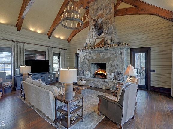 This custom 6 BD/5.5 ba lakefront home was designed for entertaining. The warm, refined rustic style creates an idyllic waterfront retreat on Lake Rabun. The 2-story great room features a vaulted ceiling, exposed beams, pine flooring, stone fireplace & floor to ceiling windows framing lake views. A lakeside screened porch acts as an outdoor living room with stone fireplace. The chef's kitchen is equipped with professional appliances, a large island and bar seating. A large front porch off the kitchen is perfect for dining 'al fresco'. The terrace level features a family room with fireplace, wet bar, laundry room, gaming area, and lakeside covered porch. Other amenities include: master on main, sauna, outdoor fire pit, new 2-stall boat house with separate swim platform.