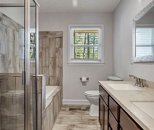 - Ceiling Fan(s), Double Vanity, Granite Counters, In-Law Floorplan, Primary Downstairs, Separate Shower