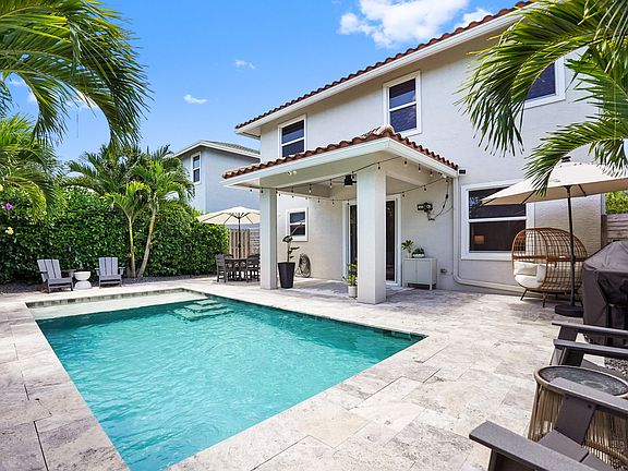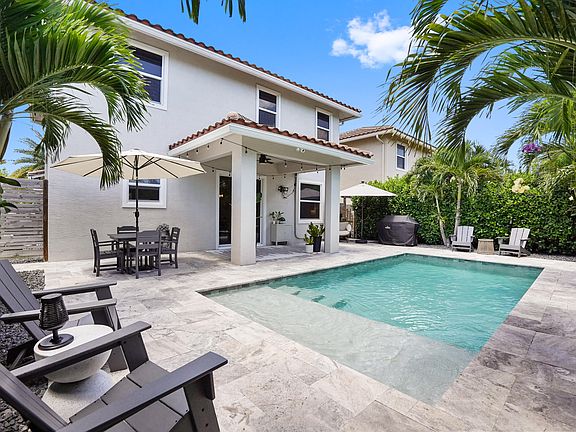 Recently renovated, this home is designed to impress, featuring impact windows and luxury finishes throughout. The open floor plan is accentuated by soaring volume ceilings, creating a spacious and inviting atmosphere. The main floor is adorned with elegant porcelain tile, setting the stage for stylish living and entertaining. The heart of the home is the cozy kitchen, where a striking island and sleek shaker cabinets combine both form and function. The adjacent dining area opens effortlessly through sliding doors to the backyard, where you'll find a covered patio and a refreshing pool, perfect for outdoor dining and relaxation. An office and a full bathroom on the main floor add to the home's versatility, offering spaces for work, guests, or additional storage.