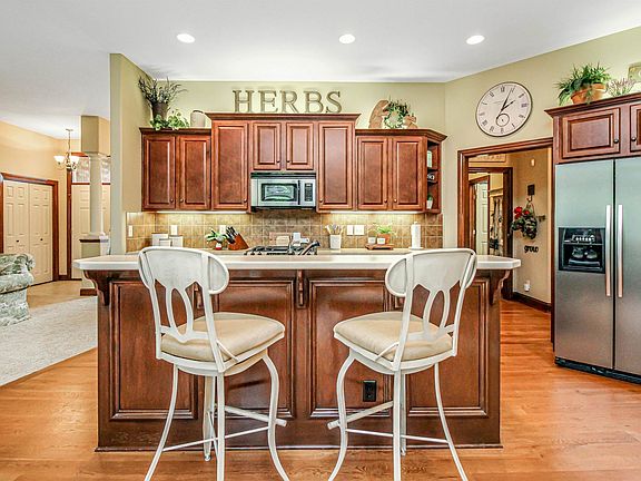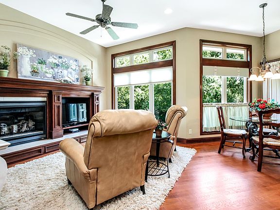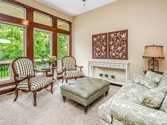 This Spectacular Ranch is situated on a forest view lot, providing ultimate privacy and breathtaking views from every room. The home is immaculate, as if it has never been lived in. As you approach the house, you'll notice its high-quality construction, featuring a full brick front with a columned porch adorned with stone accents. Upon entering the home, you'll be instantly captivated by the view across the living room, which opens up to a beautiful forest of trees in the back. The entryway is defined by a columned half wall with an arch above, and the entry door is accompanied by a sidelight and transom window. The living room itself is a perfect space for relaxation, allowing you to enjoy the panoramic view through oversized triple windows with transoms. Connected to the living room is a formal dining room, ideal for hosting dinner parties. It boasts large windows with transoms, an upgraded chandelier with a medallion, and a superb ambiance. For everyday living, the kitchen, hearth room, and breakfast nook provide comfort and tranquility with their expansive windows overlooking the forest. The island kitchen features stairstep Maple cabinetry with both over-cabinet and under-counter lighting, high-quality Fridgidaire appliances (including a gas range with an electric oven), a spacious walk-in pantry, and wood flooring. The hearth room is a cozy space with a gas fireplace and a TV box combo, complemented by a wood and tile face with recessed panel columns. The triple windows with transoms allow you to enjoy the serene forest views. Finally, the breakfast nook offers a perfect spot for family meals, where you might even catch glimpses of deer or other wildlife. The master bedroom is a luxurious retreat, featuring oversized triple windows, a coffered ceiling reaching 11 feet with a lighting tray, and an impressive ensuite bath. The bath includes a large raised double vanity, an oval tub with a rain glass window above, a spacious 4-foot shower, a generous walk-in closet with a sweater rack, and convenient access to the laundry room. On the opposite side of the home, you'll find two well-proportioned bedrooms with oversized windows and a hall bath with a raised vanity and tile floor. The basement of this remarkable home offers a spectacular space for entertaining friends and family. The family room is complete with a gas fireplace featuring a stone face that extends to the ceiling, a massive mantel, and base cabinets with bookcases on each side. The room is filled with natural light through large viewout picture windows, and a patio door leads to a walkout patio. The basement also features a pool table area and a fantastic wet bar with a raised top, recessed panel wood back, back bar equipped with wine and stemware racks, a microwave, refrigerator, and dishwasher. Adjacent to the bar area, there is a private wine tasting room with an arched entry. Additionally, two stylish bedrooms and a full bath with a raised vanity and tile floor are finished in the basement. The 3-car garage includes two openers, a walkthrough door to the yard, and a super workbench. Enjoy peaceful evenings on the covered wood deck that overlooks the forest on the east side of the home, offering a park-like setting and a yard with a sprinkler system and irrigation well. Another delightful feature of the home is the fabulous walkout patio with mosaic tile walls and floor. This one-of-a-kind home boasts several quality features, including Lennox HVAC with a humidifier, R-60 ceiling insulation, Christmas soffit outlets, oversized vinyl casement windows, concrete siding, up-down custom blinds, and a 220 wire in the back bar for a future cooktop.