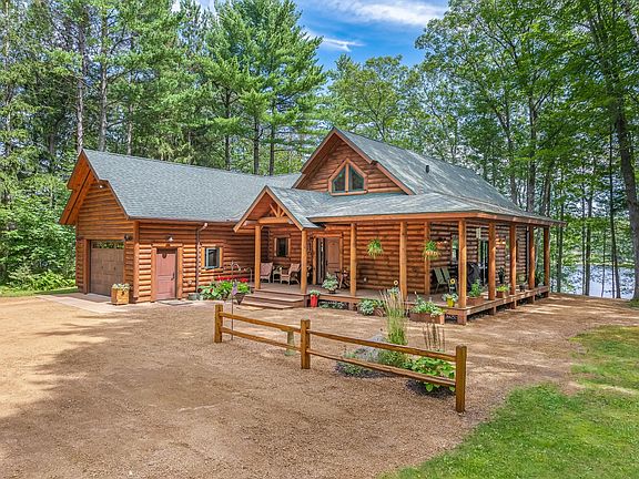 Northwoods Gem! Built in 2014 and situated amongst the towering trees on Soo Lake is this beautiful 1/2 log home with quality details throughout. The covered front porch welcomes you in and upon entry you will notice the gorgeous open-concept kitchen, knotty pine walls/ceiling, and walls of windows lake-facing, bringing in the natural light. Hickory kitchen cabinets with soft close doors and drawers, stone-faced wood-burning fireplace, Kolbe & Kolbe windows, mudroom/laundry, master bedroom suite with tiled shower, vaulted ceilings and French doors leading to the screened-in lakeside porch complete the main floor. The lower-level walkout features a family/rec room with a kitchenette area (stub-outs for water), lake-facing bedroom, 3/4 bath, and a utility room. 2 car attached garage, firepit, pier, kayak launcher, 2+ detached garage with bathroom/bunkhouse, and nicely landscaped yard complete this home. See attached list for additional home features.