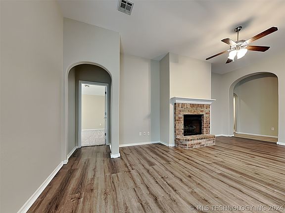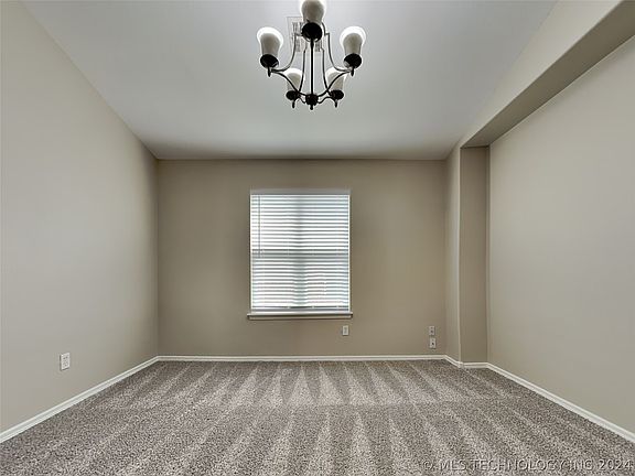 GREAT PRICE! Wonderful floorplan in Jenks ISD!! Move-in ready! Over 2200 sq. ft., one-story, with four bedrooms, two full baths, two dining areas PLUS a study! Open floorplan with kitchen and breakfast area open to living room with gas fireplace and views of the backyard. Kitchen has granite countertops and black appliances. Primary bedroom split from secondary bedrooms. Luxury vinyl plank flooring and ceramic tile in kitchen, living and hallways. New carpet in bedrooms and office. Covered patio and porch and fully fenced in backyard. Community has park, pool and trails to enjoy!