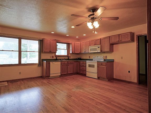 AN ATTRACTIVE STARTER RANCH WITH PERMANENT SIDING, SOFFITS AND FASCIA, A NEWER ROOF (2017) AND NEWER WINDOWS. HUGE EAT-IN KITCHEN WITH NEWER CABINETRY AND ABUNDANT COUNTER SPACE. LARGE MAIN FLOOR LAUNDRY / SEWING ROOM WITH SHOWER JUST OFF THE KITCHEN. OAK FLOORS THROUGHOUT. FURNACE IS NEWER (2016) AND THE AIR CONDITIONER WAS JUST REPLACED IN 2022. WATER SOFTENER IS OWNED AND THE HOME HAS UNDERGROUND SPRINKLERS. COVERED 20' X 8' TREX DECK, LARGE BACKYARD WITH STORAGE SHED AND MORE!
