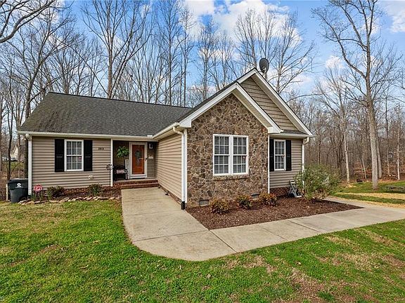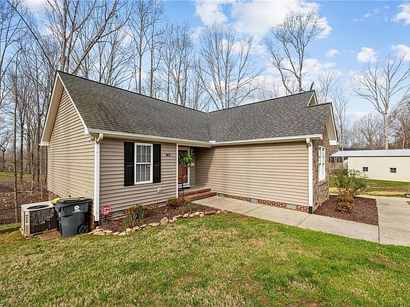 FABULOUS FIND in SW Alamance County nestled on 1.54 acres. Custom built home built in 2003 with 3 beds/2 baths on quiet cul-de-sac. EZ maintenance vinyl siding with stone accents. Split floor plan w/ vaulted family room, kitchen w/ pantry closet (ALL APPLIANCES STAY!), dining with access to deck. UPDATES: 2023 - cleaned all duct work, replaced dryer. 2022 - added 26x44 WIRED METAL BUILDING/SHOP w/ separate drive & mounted propane heater, NEW water heater, NEW granite countertops & painted cabinets. 2021 - NEW floor, roof, & door on exterior stg builidng. 2019 - NEW roof. 2018 - NEW flooring (LVP, carpet @ beds, tile @ bath), NEW gas logs, updated FP w/ new mantel and tile surround. 2017 - NEW appliances (range, DW, fridge & washer). Septic tank pumped 2022. FENCED rear yard. Water softener system (serviced annually). Additional 28x6 storage area underneath @ crawlspace. Security system ($55/mth). Short commute to Triad & Triangle areas. Southern Schools.
