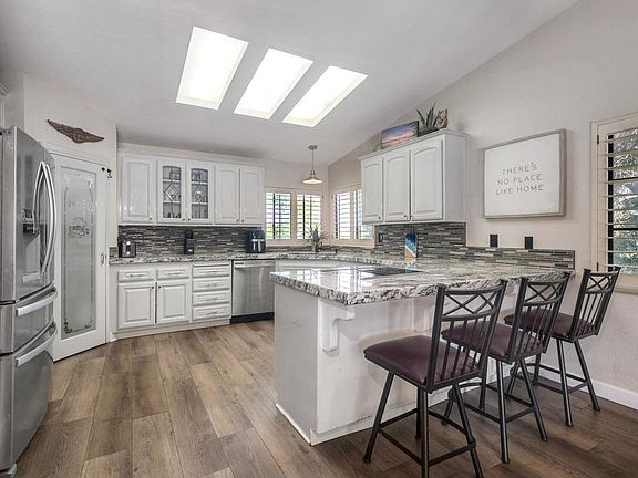 Nestled behind private gates on a sprawling 1-acre lot, this Fallbrook home offers the perfect blend of comfort, style, and functionality. All three main bedrooms and two full bathrooms are on the main floor, creating true single story living with vaulted ceilings, skylights, and an open, natural light floor plan. The modern kitchen features granite countertops, stainless steel appliances, and a lighted walk-in pantry, flowing seamlessly into the family and living areas. Beneath the home, a fully finished guest suite provides over 400 sq/ft of additional living space, complete with a kitchenette, bonus room, full bathroom, and private access; ideal for guests. Outside, enjoy mature fruit trees, terraced landscaping, views from multiple patios, including the outdoor spa. A stacked stone fireplace, abundant storage, and thoughtfully designed indoor-outdoor flow complete this exceptional home. Experience privacy, versatility, and the beauty of Fallbrook living.