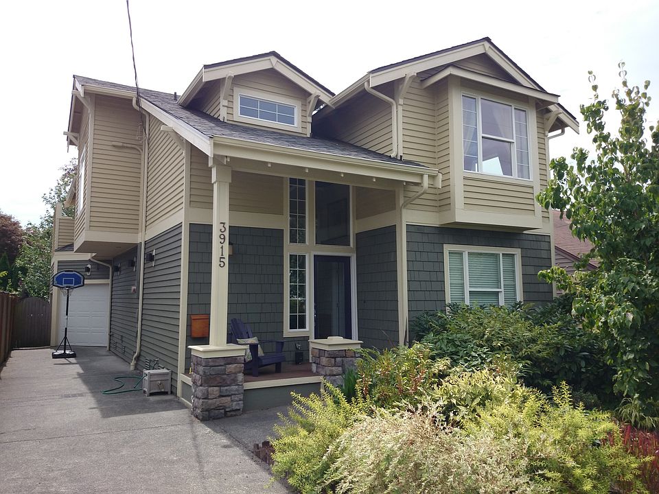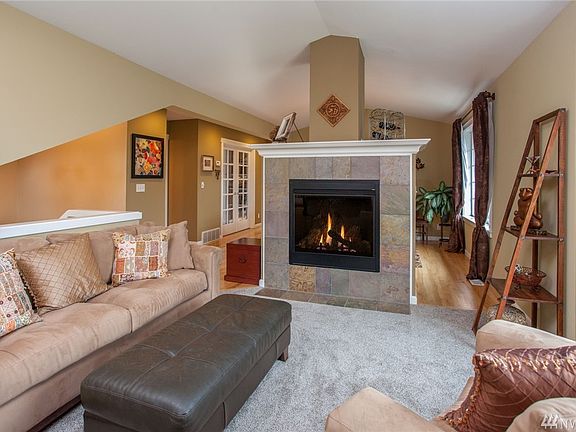 Modern flair w/Craftsman finishes & some Snd & Mtn Views. Mstr suite w/walkin closet, soaking tub & shower w/dbl controls. Lndry w/2 more bdrms & bath. Next floor w/vaulted ceilings & inviting liv/dining rms that share a 2 sided gas frplc & sets mood of comfort & warmth. Chef's kit w/ granite counters, pantry, SS appls w/gas cooktop, eating bar & family rm. French drs to office w/murphy bed. Lots of closets & storage. Lg view deck w/circ strs to fenced yrd. 1 car gar & drive w/room for rec veh