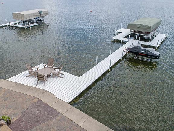 Here's the one you've been waiting for....Gorgeous lakefront home with excellent, firm, sandy bottom on a perfect walkout lot with 61' of frontage! You will appreciate the high end finishes and attention to detail from the moment you walk in the door beginning with a large open living space that takes in views from every angle. The living room features a gas log fireplace and wall of windows which flows seamlessly into the kitchen and breakfast nook areas. The kitchen has custom cabinets finished in a creamy glaze, stainless steel GE Profile appliances, granite counters, center island, walk in pantry, and large breakfast nook all designed to allow the home to flow perfectly for entertaining at the lake! Upstairs the master suite takes full advantage of the views. The details keep going with tray ceilings, spa like master bath, and walk in closet. There is a private guest suite with its own full bath plus two additional bedrooms that share a Jack & Jill bath- all with custom cabinets and stone tops. There is a full finished basement complete with wet bar, lakeside storage room, and 38x21 family/game room. Just outside the brick paver patio will take you down to the lake with just a few steps to the water. The property has beautiful landscaping, brick paver patio and driveway, maintenance free exterior and decking, whole house sound system, and so much more! There is a 2 car attached garage, plus a large back lot with additional garage and storage building.