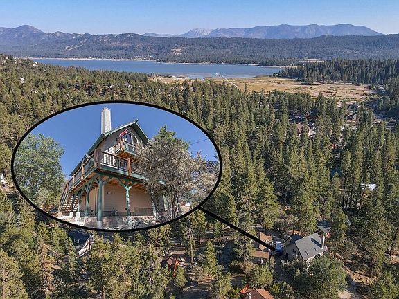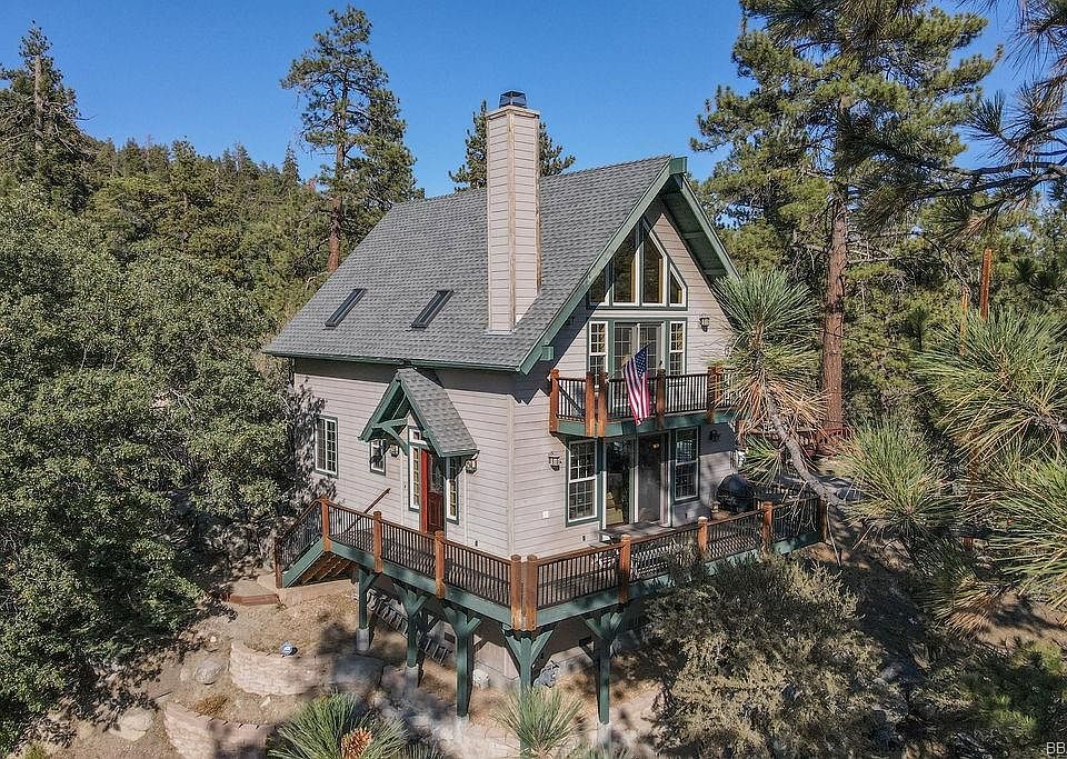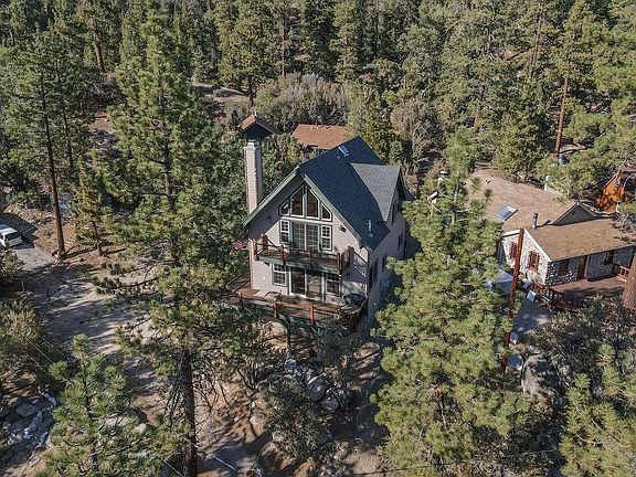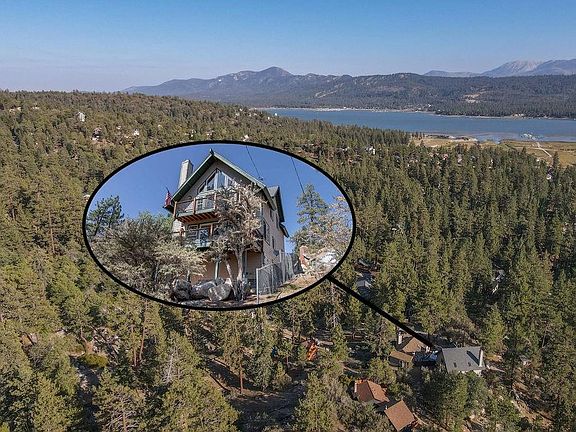 GORGEOUS SETTING FOR THIS CUSTOM BUILT FAWNSKIN HOME WITH LOVELY VIEWS OF THE FOREST, BOULDERS, AND SURROUNDING MOUNTAINS...... Attention to detail is evident with upgraded lighting (Kitchler & Quoizel) & plumbing fixtures, vaulted tongue and groove wood ceilings, Kohler jetted tub, custom tiled bathrooms and Velux skylights. Warm wood laminate flooring with river rock fireplace. Spacious kitchen has stainless steel appliances and adjacent dining area. Light & bright interior with oversized windows and sliders, allowing for great views. One bedroom and bathroom plus large laundry/mudroom on the lower level. Upper level primary bedroom features a gas-log fireplace and view balcony. Guest bedroom has nice treed views and a huge walk-in closet that could be another room. Beautiful wrap-around decking made of Brazilian mangaris. Fire-rated siding and roofing. Lot of storage space. Quiet, cul-de-sac location, just a short distance to the National Forest and 10-15 min. to town.